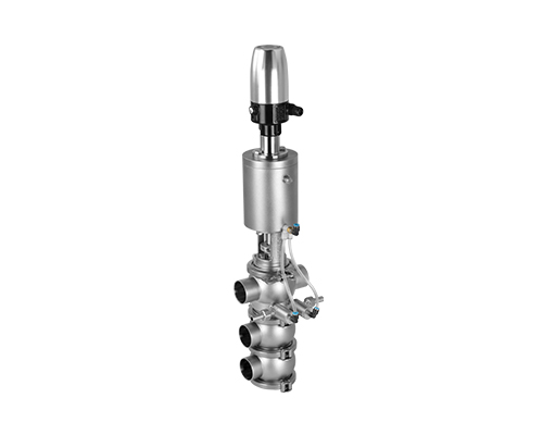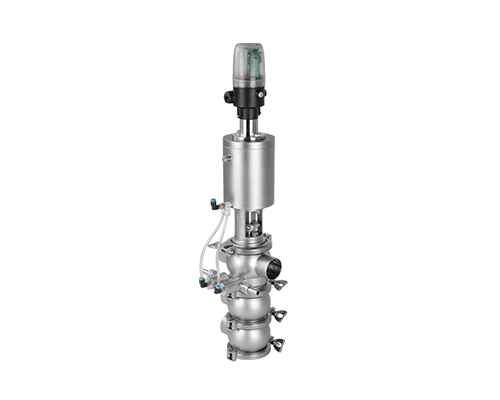 E-C系列防混閥主要由執(zhí)行機(jī)構(gòu)、連接支架、閥桿、閥體組成,閥桿通過執(zhí)行器機(jī)構(gòu)驅(qū)動(dòng)做軸向直線運(yùn)動(dòng),閥桿向上運(yùn)動(dòng)時(shí),上下管路通道開啟;閥桿向下運(yùn)動(dòng)時(shí),通道關(guān)閉。閥桿上設(shè)計(jì)有兩道密封圈與閥體密封面形成獨(dú)立的密封腔,與CIP閥相通,可用于密封檢漏;或上下管路流通不同介質(zhì)時(shí)起到防混監(jiān)測的作用。