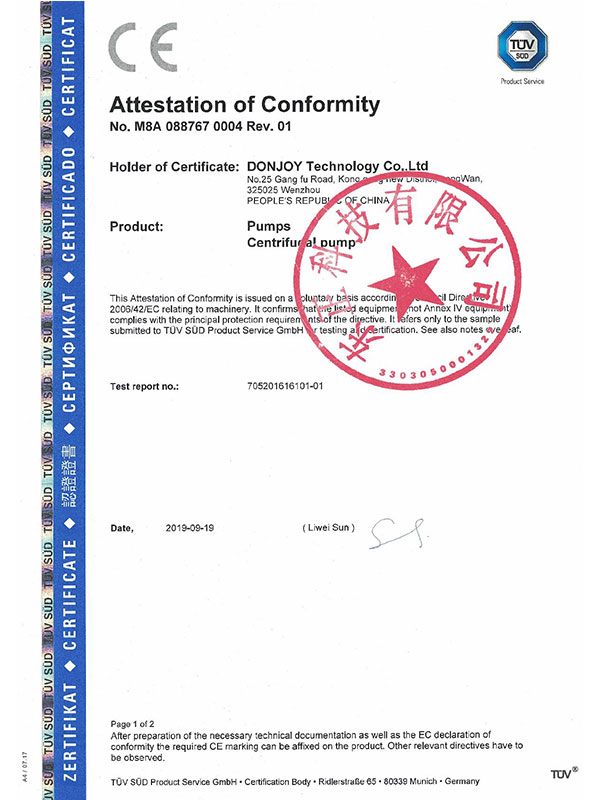 離心泵系列包含:KS/KLX/LX/ZLX/SLX/SCLX/CLX/MLX/DLX/BS,自吸泵包含:ZLX、CIP-U/L系列,已獲得德國 TüV 機構(gòu)實施的歐盟機械設(shè)備安全指令 MD-06/42/EC 產(chǎn)品質(zhì)量認(rèn)證;證書號:N.O.: N8MA088767003; 測試報告:N.O.: 705201616101-01