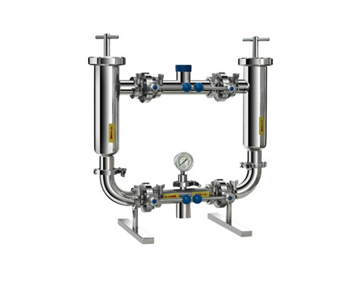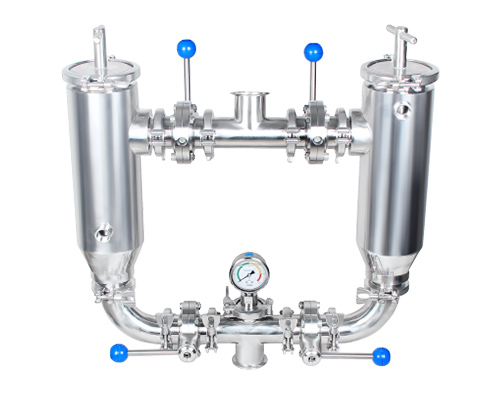 該雙聯(lián)過濾器適用于去除鮮奶、糖液、飲料等液體中各桶內(nèi)肉眼無法看見的固體物的凈化。兩只過濾器交替使用,可不停機(jī)更換或洗濾網(wǎng),適用于長期連續(xù)生產(chǎn)。
