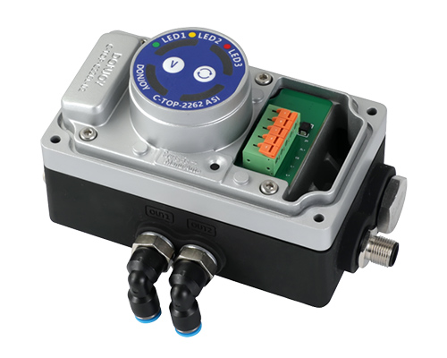 C-TOP-2262是一款本安防爆設計的閥門控制單元,它接收來自PLC/DCS或其他自控系統(tǒng)指令進行工作,同時反饋當前閥門位置信號到PLC/DCS等自控系統(tǒng),也可通過IO-Link、AS-I V3.0版本總線通訊。每個位置都會通過不同位置顏色LED燈顯示當前狀態(tài)。